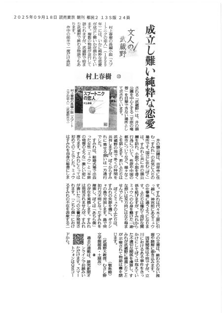村上春樹の長編小説「スプートニクの恋人」(1999年)には、いかに純粋な恋愛が成立し難いかが描かれています。複数の物語が並行して語られますが、武蔵野で始まり武蔵野で終わる物語でもあります。