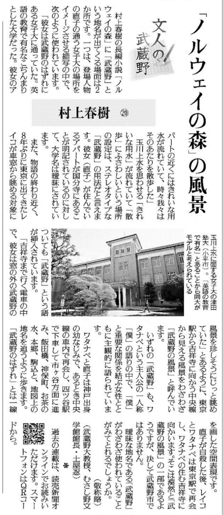 村上春樹の長編小説「ノルウェイの森」に「武蔵野」という地名が出てくる場面は1か所です。一つは、登場人物の直子の通う女子大の場所をイメージさせる描写の中で、次のように使われています。